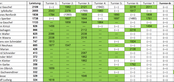 Herzlichen Glückwunsch an Richard Schneider zum Gewinn! Zur Erläuterung: die besten sechs Leistungen (grün) gehen in die Wertung ein.